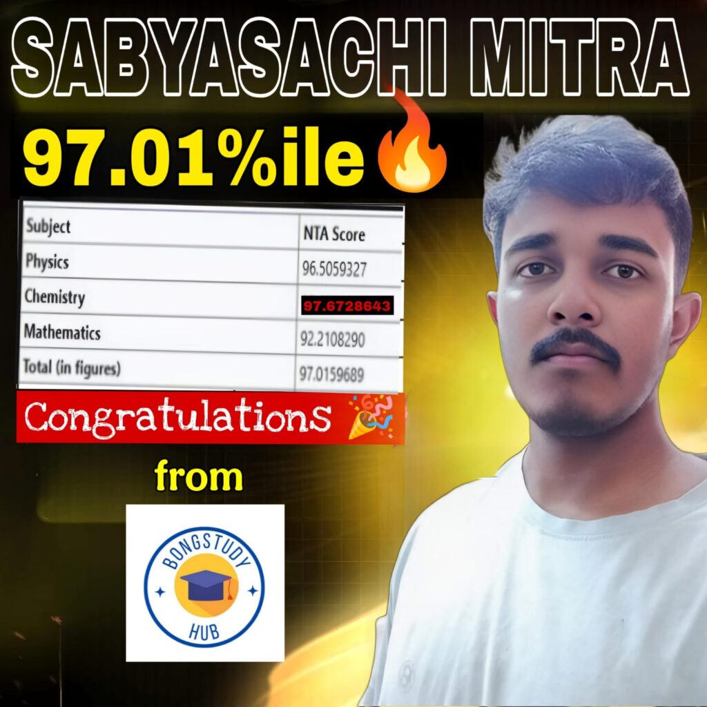 Score InformationPhysics : 96.5059327Chemistry : 97.8728241Mathematics : 92.2108290Total (in figures) : 97.0159689Percentile : 97.01