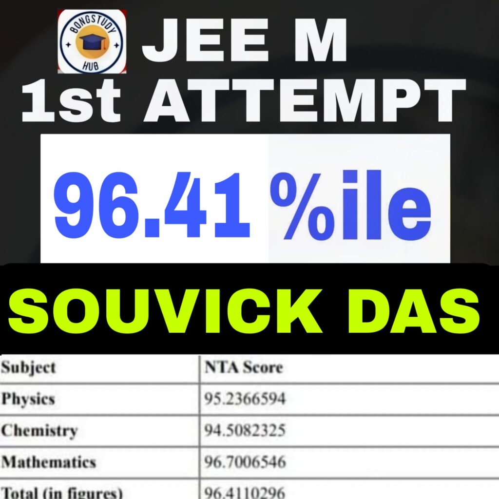 Score InformationPhysics : 94.3773276Chemistry : 94.9168862Mathematics : 95.5672631Total (in figures) : 96.1340721Percentile : 96.13